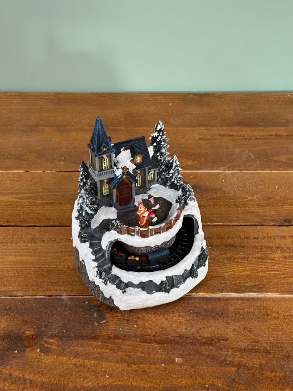 Asztal dísz, templommal, világítő mozgő vasuttal