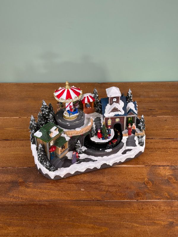 Asztal dísz, világító mini falu, pörgó körhinta, mozgó kisvasúttal, 3 db AA elmemmel, vagy adapterrel működik, mely nem tartozéka