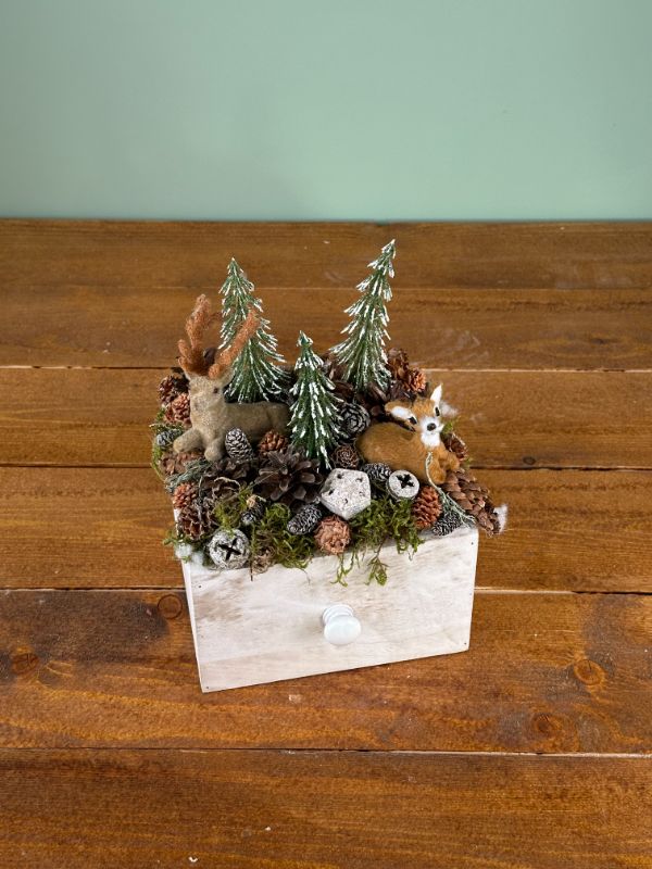 Asztali dísz, fa ládikóban, őzekkel, fenyővával