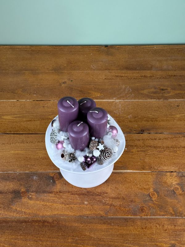Karácsonyi asztal dísz kerámia cilinderben,lila gyertyával, termésekkel, üveg díszekkel