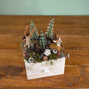 Asztali dísz, fa ládikóban, őzekkel, fenyővával